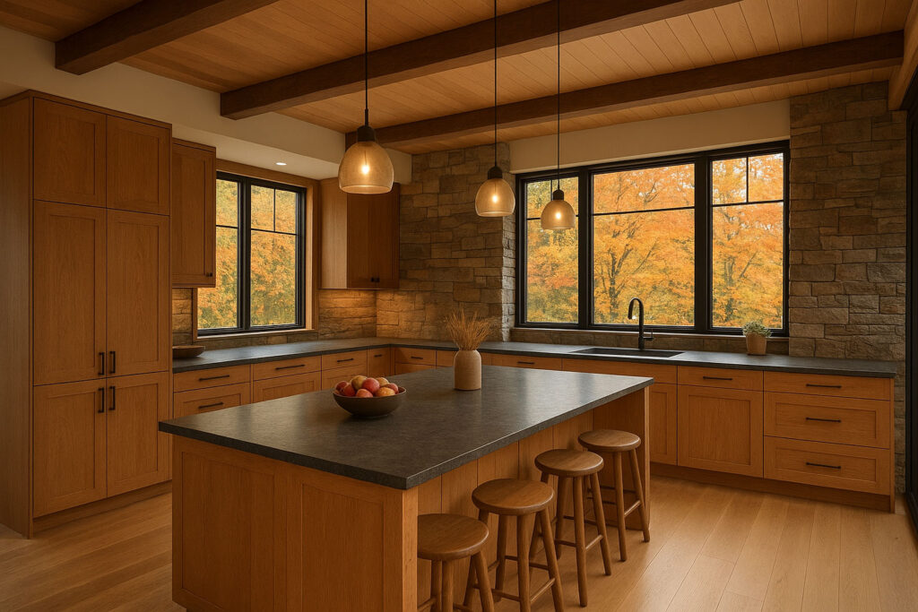 Lighter oaks, walnut finishes, or bamboo surfaces create visual comfort and tactile richness.